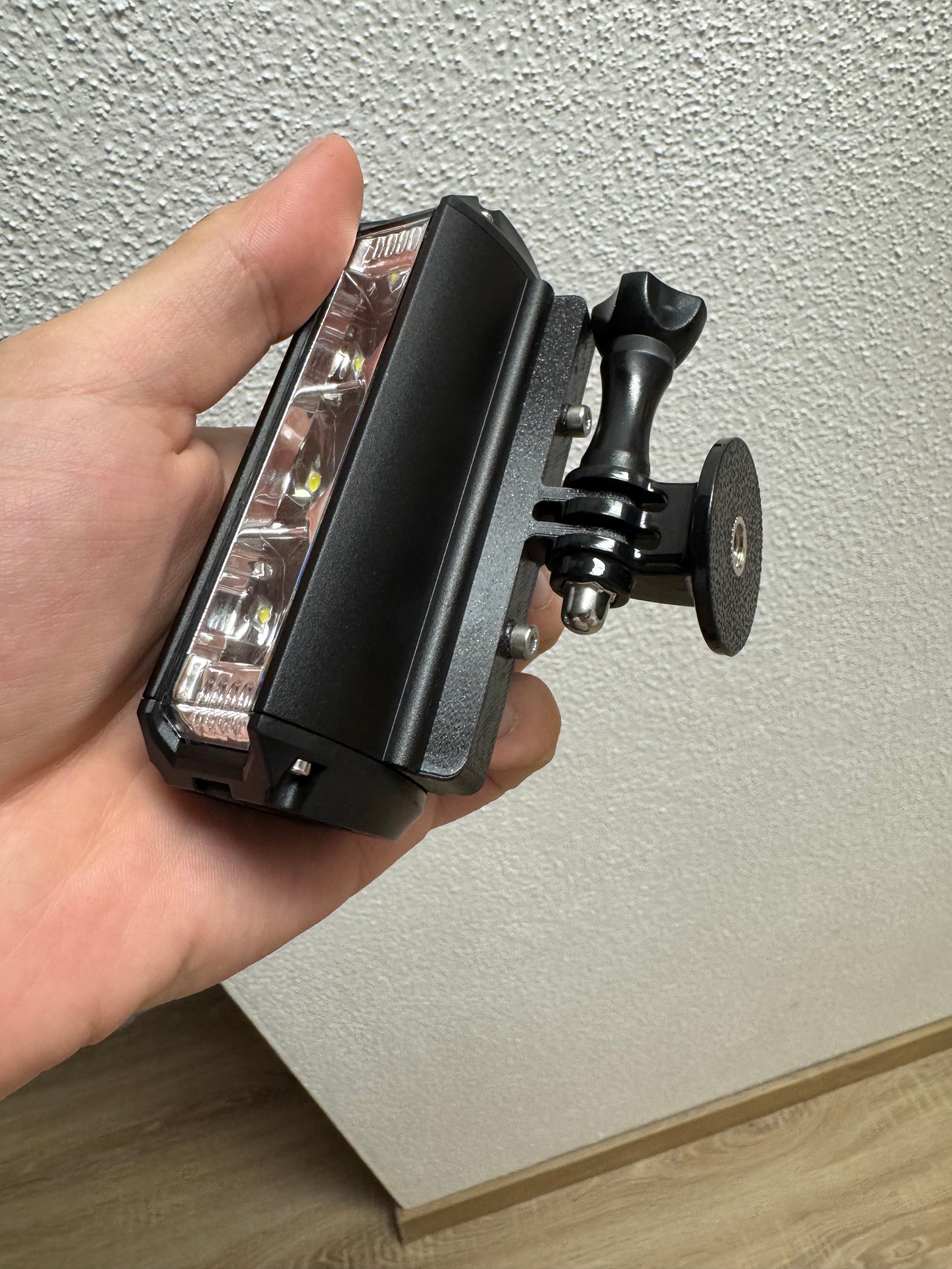 Diese passgenaue Halterung ermöglicht die einfache und sichere Montage von einer Monkey Home Fahrradlampe (Typ: Ahead, 1.700 lm) an einem GoPro-Gewinde-Fuß (M6-Gewinde).